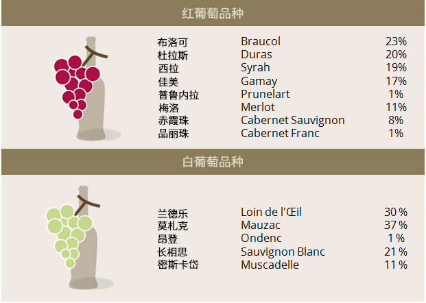 加亞克的3大主要子產區分別為右岸(Rive Droite)、左岸(Rive Gauche)和科代高原(Plateau Cordais)。其中位于塔恩河(Tarn River)以南的右岸產區地勢高,可俯瞰整個塔恩河。該產區的葡萄園以黏土和石灰巖土壤為主,出產著優質的莫札克和布洛可。其中由莫札克釀成的酒既有優雅柔順且回味悠長的干型白葡萄酒,又有芳香馥郁的甜酒,而布洛可紅葡萄酒則充滿水果和香料風味。塔恩河以北的左岸產區地勢較低,以鵝卵石、砂土和礫石為主,有著孕育優質紅葡萄酒的杰出風土。這里出產的杜拉斯紅葡萄酒風格強勁有力、單寧圓潤,而白葡萄酒雖不比右岸的脆爽,但采用蘭德樂釀成的白葡萄酒卻有著出色的復雜度。此外,該產區還出產著品質優異的遲摘(Late Harvest)葡萄酒。位于加亞克北部的科代高原以石灰巖為主,其出產的白葡萄酒擁有清新的花香和果香,紅葡萄酒口感平衡、適宜陳年,桃紅葡萄酒果味芳香、酒體輕盈。