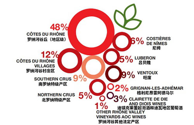 2019年,在羅納河谷葡萄酒約2.8億升的總產量中,紅葡萄酒貢獻了近2.09億升,占總產量的75%;桃紅葡萄酒的產量約為0.43億升,占總產量的15%;白葡萄酒的產量約為0.27億升,占總產量的10%。