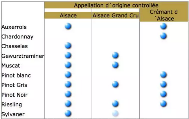 阿爾薩斯三種原產地命名制度和葡萄品種對應圖