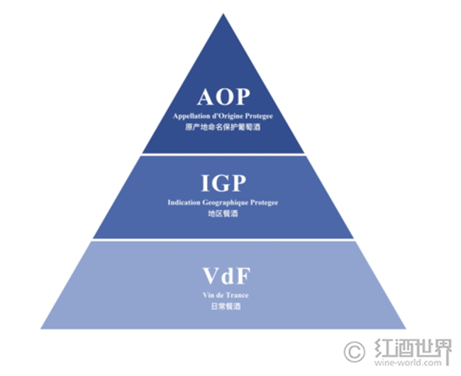 后來(lái)為了響應(yīng)歐盟的改革并配合歐洲農(nóng)產(chǎn)品級(jí)別標(biāo)注形式,法國(guó)于2012年推出新的分級(jí)體系——原產(chǎn)地命名保護(hù)制度(Appellation d'Origine Protegee,簡(jiǎn)稱AOP)。這個(gè)體系從高至低包含原產(chǎn)地命名保護(hù)葡萄酒(AOP)、地區(qū)餐酒(Indication Geographique Protegee/IGP)與日常餐酒(Vin de France/VdF)三個(gè)級(jí)別,分別取代原來(lái)的AOC、VdP和VdT,并撤銷了VDQS 這一等級(jí),原有的 VDQS 葡萄酒或升級(jí)為AOP,或降級(jí)為VdF。