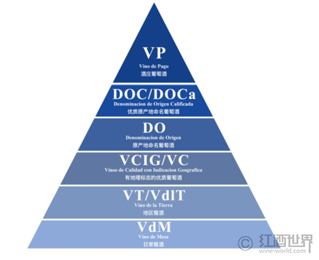 西班牙在20世紀(jì)30年代初期就擬定了原產(chǎn)地命名制度(Denominacion de Origen,簡(jiǎn)稱DO),但直到70年代才正式頒布實(shí)施。傳統(tǒng)的西班牙葡萄酒分級(jí)體系和法國(guó)的等級(jí)劃分大有不同,不過(guò)自2003年改革后,其框架已越來(lái)越接近于法國(guó)的分級(jí)體系。西班牙的葡萄酒分級(jí)包含以下6個(gè)級(jí)別: