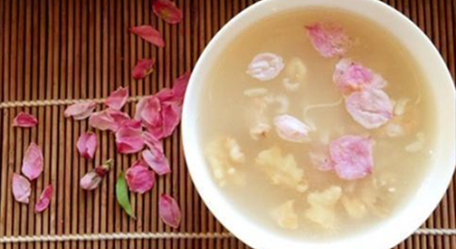 桃花粥香潤可口,一片片桃花散發(fā)出迷人的清香,與甜美的起泡酒能形成很好的搭配。