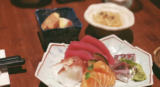 刺身是日料中非常著名的一道菜式。這道美食是將新鮮的北極貝、赤貝、甜蝦、海膽、魷魚、三文魚、金槍魚等利用特殊刀工切成片、條、塊等形狀,佐以醬油、芥末或檸檬汁直接生食。優質的刺身搭配白葡萄酒和香檳(Champagne)是常見的選擇。除了一些經過橡木桶處理、風格濃郁的白葡萄酒之外,大多數風味純凈的白葡萄酒都可嘗試與刺身搭配。