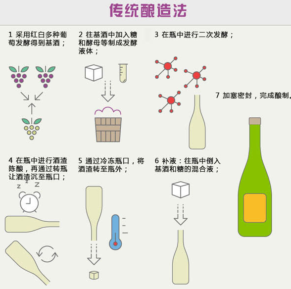 采用傳統(tǒng)釀造法釀制的起泡酒有很多,香檳就是其中之一。除此之外,還有香檳之外的其它法國起泡酒、西班牙的卡瓦以及意大利的弗朗齊亞柯達(dá)等。