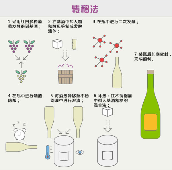 轉(zhuǎn)移法和傳統(tǒng)釀造法在初期階段極為相似,不過前者在瓶中發(fā)酵完成后,會轉(zhuǎn)移至不銹鋼灌中進(jìn)行澄清,完成剩余步驟,然后再重新裝瓶。
