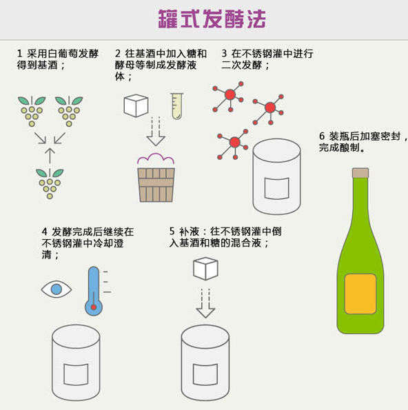 罐式發(fā)酵法最大的優(yōu)點(diǎn)就是成本低,耗時少,節(jié)省勞動力,目前世界上大多價格實(shí)惠的起泡酒都采用罐式發(fā)酵法釀制。這種起泡酒一般口感簡單,香氣明顯。不過,由于沒有進(jìn)行酒渣陳釀,少了酵母帶來的復(fù)雜風(fēng)味,因此嘗起來就像靜止葡萄酒中加入了氣泡一樣