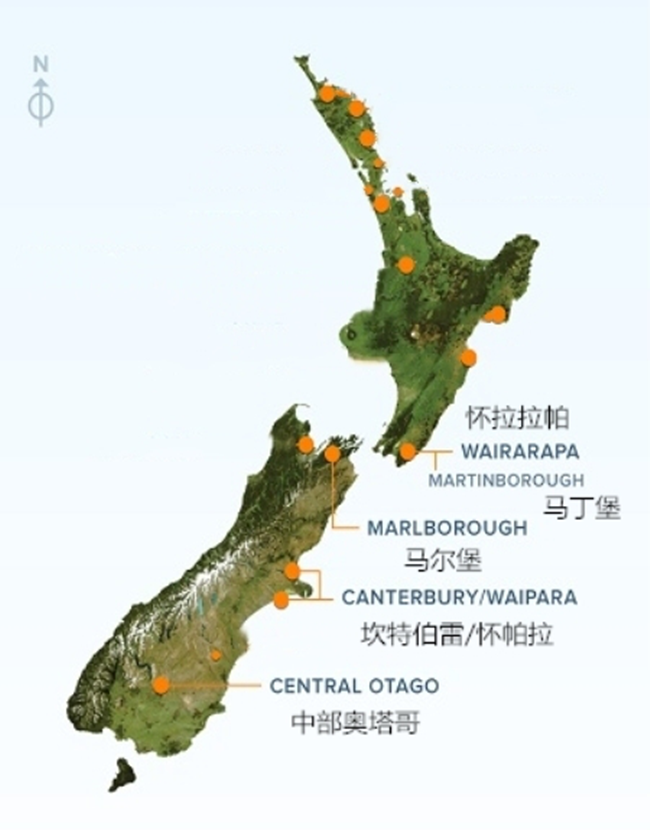 黑皮諾占新西蘭紅葡萄品種總種植量的72%,它也是該國(guó)種植面積第二大的品種,僅次于長(zhǎng)相思(Sauvignon Blanc)。由于黑皮諾更適合在較涼爽的氣候下生長(zhǎng),因而主要分布在北島南端以及南島幾大產(chǎn)區(qū)。各產(chǎn)區(qū)的土壤和氣候等自然條件豐富多樣,釀出的黑皮諾葡萄酒也具有繽紛多彩的風(fēng)格。
