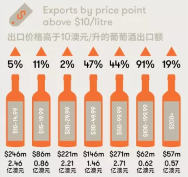 另外一個突出的部分是價格區間在30澳元或以上(離岸價)的葡萄酒出口額的增長,凸顯了市場對澳大利亞最優質葡萄酒日益增長的需求。