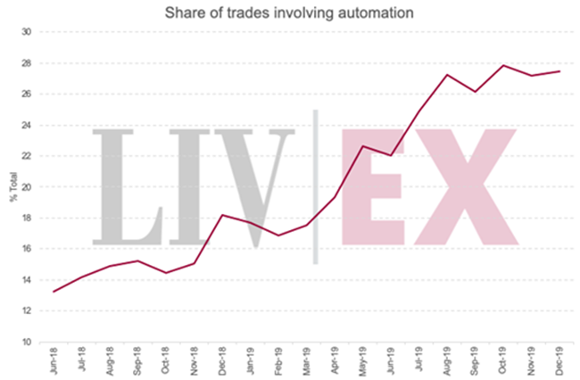 如下圖所示,在過去的18個月,在Liv-ex上涉及自動化的交易數量一直上升。