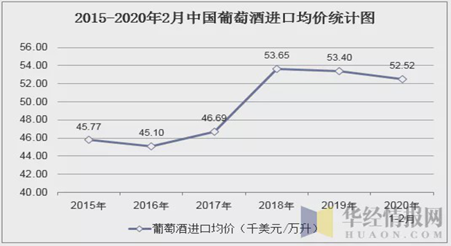 華經(jīng)產(chǎn)業(yè)研究院數(shù)據(jù)顯示:2020年1-2月中國(guó)葡萄酒進(jìn)口數(shù)量為8260萬(wàn)升,相比上年同期減少了3616.5萬(wàn)升,降幅為30.4%;進(jìn)口金額為433794千美元,相比上年同期減少了171071千美元,降幅為28.3%;2020年1-2月中國(guó)葡萄酒進(jìn)口均價(jià)為5.252美元/升。
