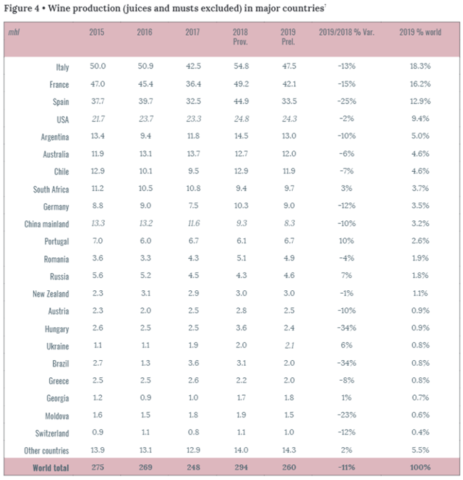意大利(47.5 百萬升)、法國(42.1 百萬升)和西班牙(33.5 百萬升)在2019年的葡萄酒產量合計占世界葡萄酒產量的48%,相比2018年,它們的葡萄酒產量大幅下降。意大利2019年的產量僅比上一個五年平均水平低2%,而法國和西班牙的差距則大得多,分別下降了6%和11%。
