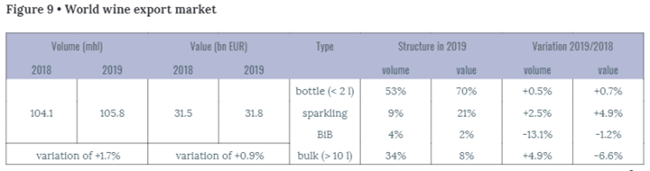 在主要出口國中,法國(71%)、德國(74%)、葡萄牙(80%)和阿根廷(67%)在2019年的瓶裝出口份額非常高。瓶裝葡萄酒占2019年全球葡萄酒出口總價值的70%。