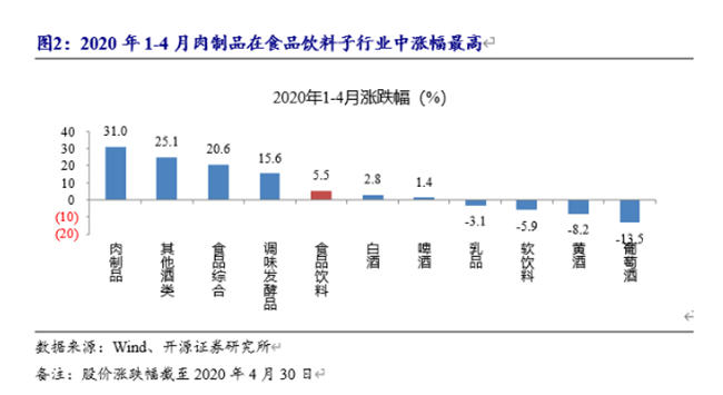 尤其是進(jìn)入2020年4月份以來(lái),食品飲料板塊上漲9.4%,其中重要原因是:國(guó)內(nèi)疫情控制得當(dāng),消費(fèi)回暖,以白酒為代表的可選消費(fèi)重新獲得市場(chǎng)青睞,漲幅領(lǐng)跑各大品類,為13.8%,而葡萄酒銷售亦有上漲趨勢(shì),為5.5%。