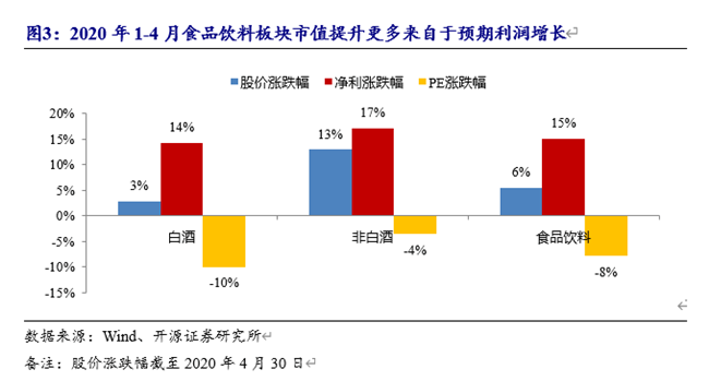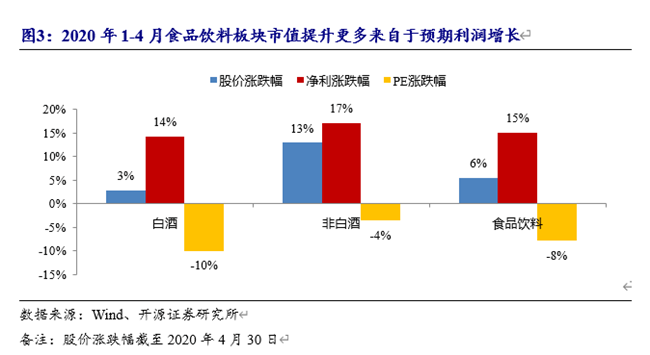 2020年1-4月食品飲料板塊上漲5.5%,在一級(jí)子行業(yè)中排名第三。漲幅分解來(lái)看,預(yù)計(jì)2020年凈利增長(zhǎng)15%。
