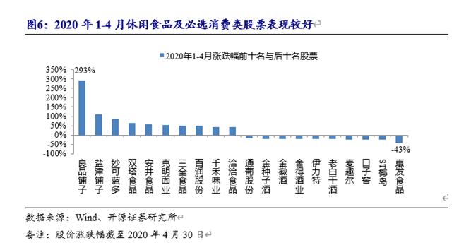 疫情期間消費(fèi)場(chǎng)景發(fā)生變化,封城、封路、居家隔離使得消費(fèi)者更多集中在家庭消費(fèi),具有居家囤貨需求的必選消費(fèi)以及具備“宅文化”屬性的休閑食品表現(xiàn)較好。其中,葡萄酒品類中的通葡股份有著較突出表現(xiàn)。