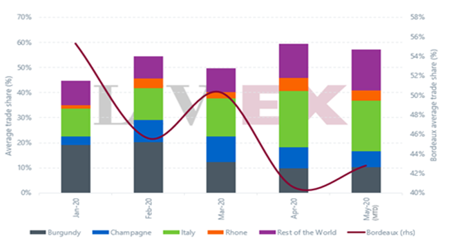 意大利成為了最耀眼的新星。上月,該酒區的交易份額升至22.5%的歷史新高;部分是由于免美國關稅、以及廣受好評的布魯諾Brunello ’15年和巴羅洛Barolo ’16的發布活動所推動。 羅納(5.2%)和“世界其它酒區”(13.3%)的交易份額也有增加。