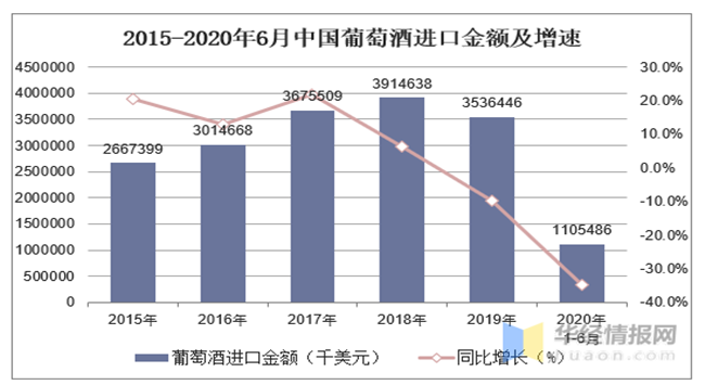 2020年6月中國葡萄酒進口數量為4160萬升,同比下降29.4%;進口金額為215005千美元,同比下降29.7%。