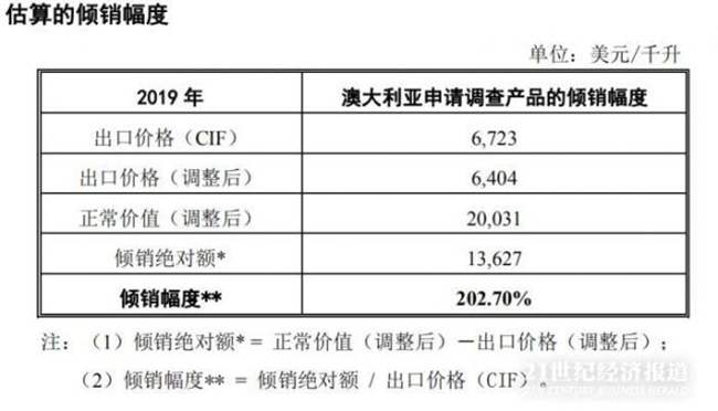 申請書認為,在進口數量持續(xù)大幅增長、市場份額持續(xù)上升、相對于國內同類產品總產量的比例也在持續(xù)上升的情況下,澳大利亞該類葡萄酒的降價行為對國內產業(yè)造成了巨大的沖擊,申請書預估,澳大利亞該類葡萄酒的傾銷幅度為202.70%。