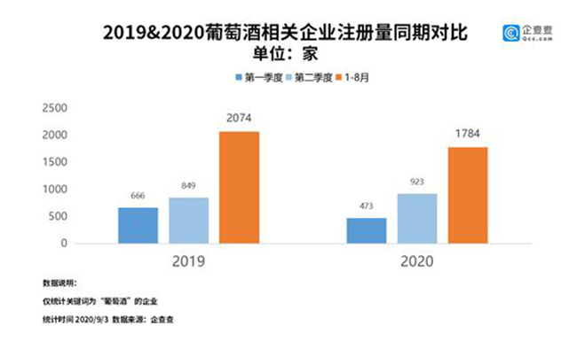 企查查數(shù)據(jù)顯示,今年上半年,我國葡萄酒相關的企業(yè)共注冊了1396家,同比下降7.9%。其中一季度注冊量為473家,二季度注冊量增長到923家。今年1-8月,我國葡萄酒相關企業(yè)的注冊量是1784家,同比下降14%。