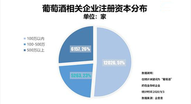 由于疫情發(fā)生在酒類銷售旺季的春節(jié)期間,使得葡萄酒生產(chǎn)商受到較大影響,13家上市葡萄酒企均呈現(xiàn)虧損狀態(tài)。企查查數(shù)據(jù)顯示,目前我國共有2.3萬家葡萄酒相關企業(yè),其中山東以3266家排名第一,廣東、福建緊隨其后。2019年,相關企業(yè)新增3212家,同比增長7%,今年以來新增量為1784家,同比下降14%。此外,全行業(yè)51%的企業(yè)注冊資本低于100萬。