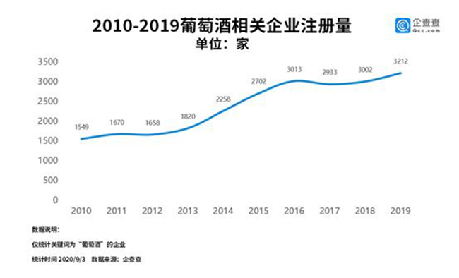 從企業(yè)發(fā)展情況來看,企查查數(shù)據(jù)顯示,過去十年來,我國葡萄酒相關的企業(yè)年注冊量平穩(wěn)上升。其中2013年至2016年注冊量增長較快,2016年注冊量首次突破3000家,此后幾年數(shù)據(jù)有所回落。2019年注冊量為3212家,同比增長7.0%。