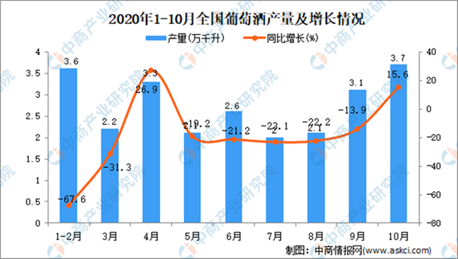 據中商產業研究院數據庫顯示,2020年10月全國葡萄酒產量增長,2020年10月全國葡萄酒產量為3.7萬千升,同比增長15.6%。2020年1-10月全國葡萄酒產量為32萬千升,同比增長4.6%。