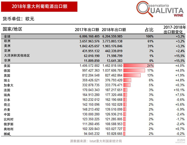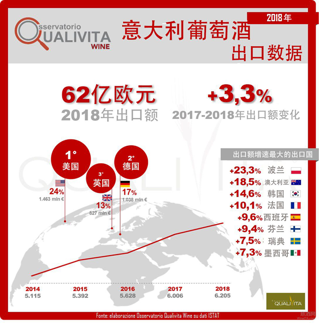 與2017年相比,意大利葡萄酒對(duì)其主要海外市場(chǎng)的出口額均實(shí)現(xiàn)了增長(zhǎng),按上升幅度來看依次是:意大利葡萄酒對(duì)法國出口額同比2017年增加10.1%,對(duì)瑞典出口額增加7.5%,對(duì)瑞士出口額增加4.8%,對(duì)美國和德國出口額均增加4%,對(duì)英國出口額增加1.9%。