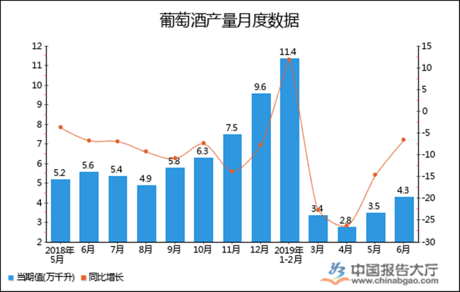 根據(jù)中國(guó)報(bào)告大廳對(duì)2019年1-6月全國(guó)葡萄酒產(chǎn)量進(jìn)行監(jiān)測(cè)統(tǒng)計(jì)顯示:2019年6月全國(guó)葡萄酒產(chǎn)量4.3萬千升,同比下降6.5%,2019年1-6月全國(guó)葡萄酒產(chǎn)量為24.5萬千升,累計(jì)下降19.9%。