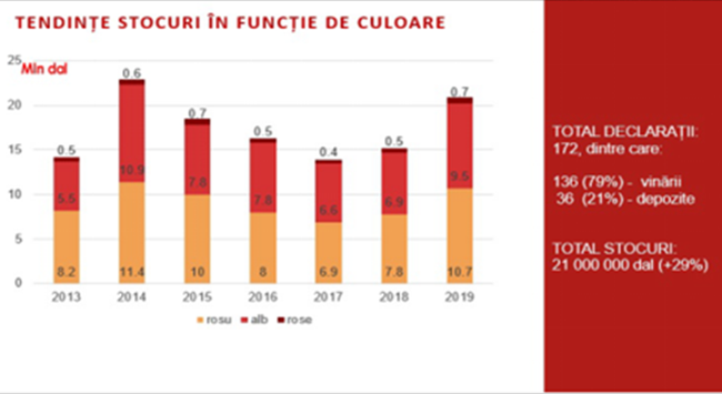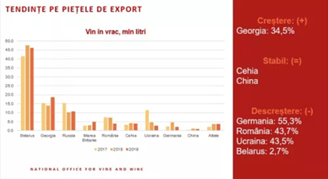 在2018-2019葡萄酒年,基于過(guò)去兩年創(chuàng)紀(jì)錄的大收成,葡萄酒供需比基本上達(dá)到了自2013年實(shí)施禁運(yùn)后的數(shù)值。過(guò)去7年的平均數(shù)據(jù)顯示,鑒于摩爾多瓦共和國(guó)85%的葡萄酒銷往國(guó)外,產(chǎn)自摩爾多瓦的葡萄酒是出口市場(chǎng)所能消化的4倍。