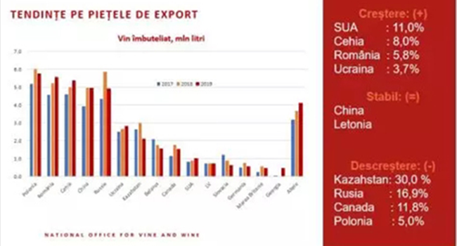 波蘭、羅馬尼亞、捷克、中國(guó)和俄羅斯仍然是摩爾多瓦瓶裝葡萄酒的主要市場(chǎng)。出口到美國(guó)(+11%)、捷克共和國(guó)(+8%)、羅馬尼亞(+5.8%)、烏克蘭(+3.7%) 的瓶裝葡萄酒數(shù)量有所增加,出口到中國(guó)和拉脫維亞的數(shù)量保持穩(wěn)定,但是出口至哈薩克斯坦(-30%)、俄羅斯(-16.9%)、加拿大(-11.8%)、波蘭(-5%)的瓶裝葡萄酒數(shù)量有所下降。