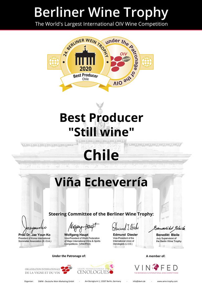 與此同時,智利-安智利雅家族酒莊(Echeverria Family Wines)更是在此項賽事中榮獲了“2020柏林葡萄酒大獎賽-智利最佳生產(chǎn)商”的稱號!其實一切的榮譽都離不開安智利雅家族酒莊自身扎實的發(fā)展戰(zhàn)略,自1700年起,安智利雅家族在智利農(nóng)業(yè)領域始終業(yè)績出眾,20 世紀初便開始從事葡萄栽植及釀酒行業(yè)。安智利雅家族酒莊更是擁有一個堅不可摧的工作團隊,具有悠久的釀酒傳統(tǒng)與經(jīng)驗,且與環(huán)境和諧共存!其強大的凝聚力來自深邃的家族根基、對釀酒藝術的共同激情、對完美的不懈追求以及為達到客戶滿意而作出的全身心的投入!